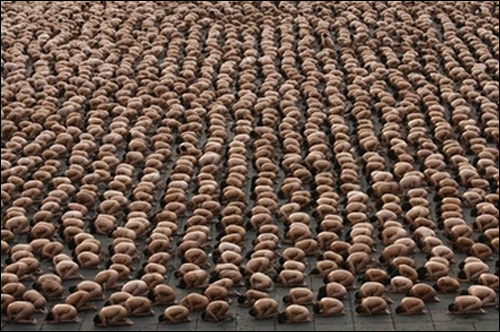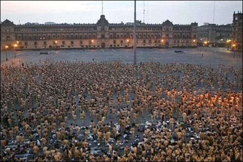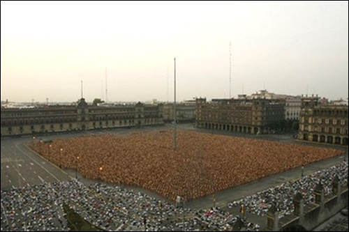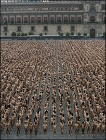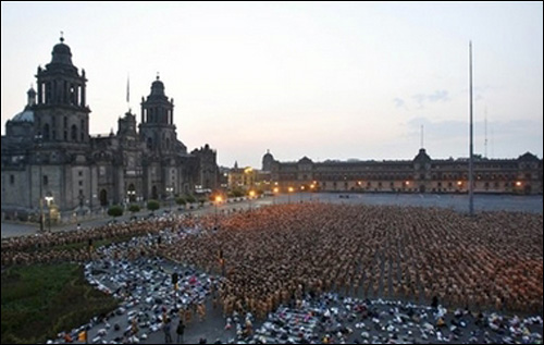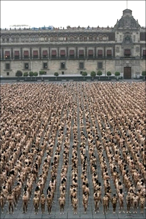 مكسيكو سيتي (رويترز) - خلع 18 ألف شخص ملابسهم في ساحة زوكالو بمدينة مكسيكو سيتي حتى يتاح للمصور الأمريكي سبنسر تونيك التقاط صورهم يوم الأحد. ويقع الميدان في قلب موقع إمبراطورية الأزتيك العتيقة. وأثار تونيك دهشة الكثيرين بسبب الصور التي يلتقطها لحشود من العراة من دوسلدورف بألمانيا إلى كاراكاس بفنزويلا.