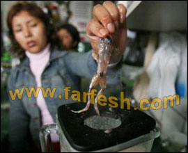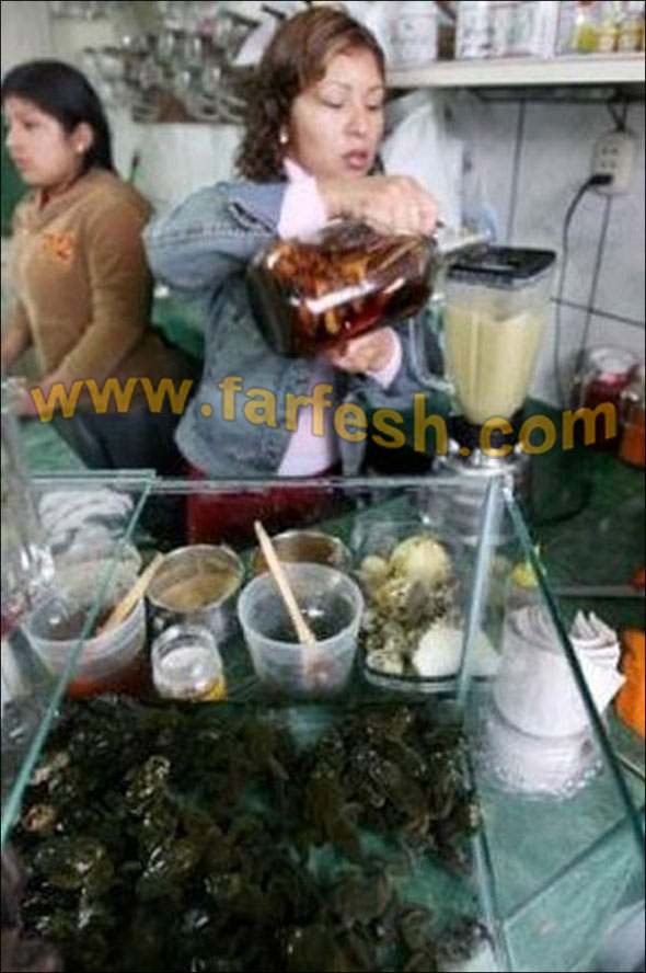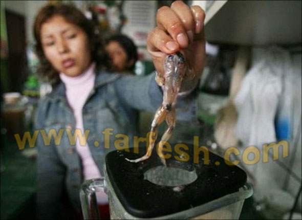 كثيرا ما نسمع عن غرائب وعجائب الطعام في دول العالم المختلفة، وهذه المرة ومن اقصى الغرب نأتيكم بشراب فريد من نوعه، تقوم صاحبة مطعم في شرق العاصمة البيروفية ليما بصنعه ويسمى "الفياجرا البيروفية"، اذ له خواص حبة "الفياغرا" مكون من الضفادع. حيث يقوم الزبون نفسه بإخراج الضفادع الحية التي يختارها من حوض المياه ويعطيها لصاحبة المطعم.