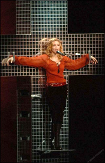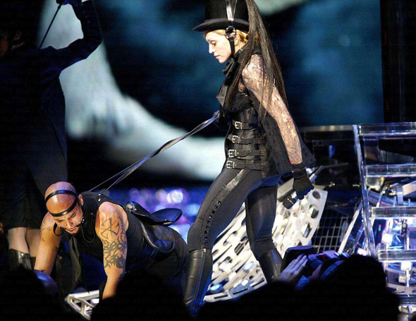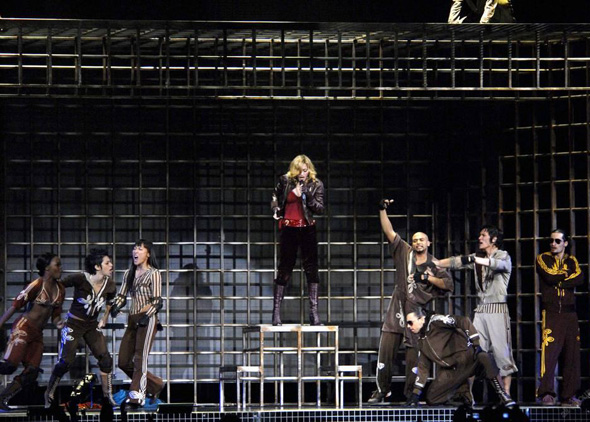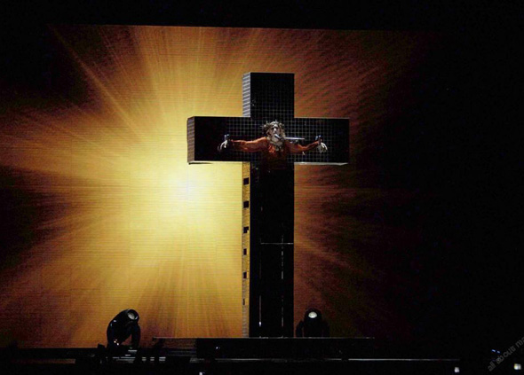 وفي العرض الجديد المثير للجدل للنجمة المشهورة وهي كاثوليكية المولد قبل تحولها الى عقيدة الكابالا تظهر وهي ترتدي تاجا من الشوك في تقليد للسيد المسيح وتهبط على صليب لامع معلق في جزء من عرض (جولة الاعترافات) الذي تجوب به مناطق في العالم.