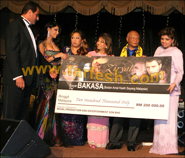وفى ختام الحفل اهدت هيفاء شيك باسم الشركة الراعية للحفل Regal Production لجمعية خيرية خاصة بانشطة واعمال لمساعدة الاطفال الايتام.
